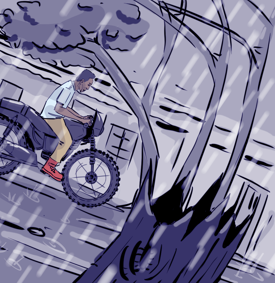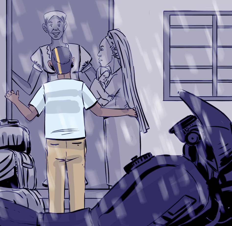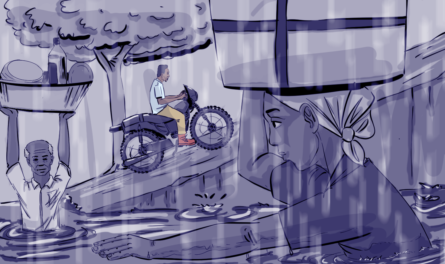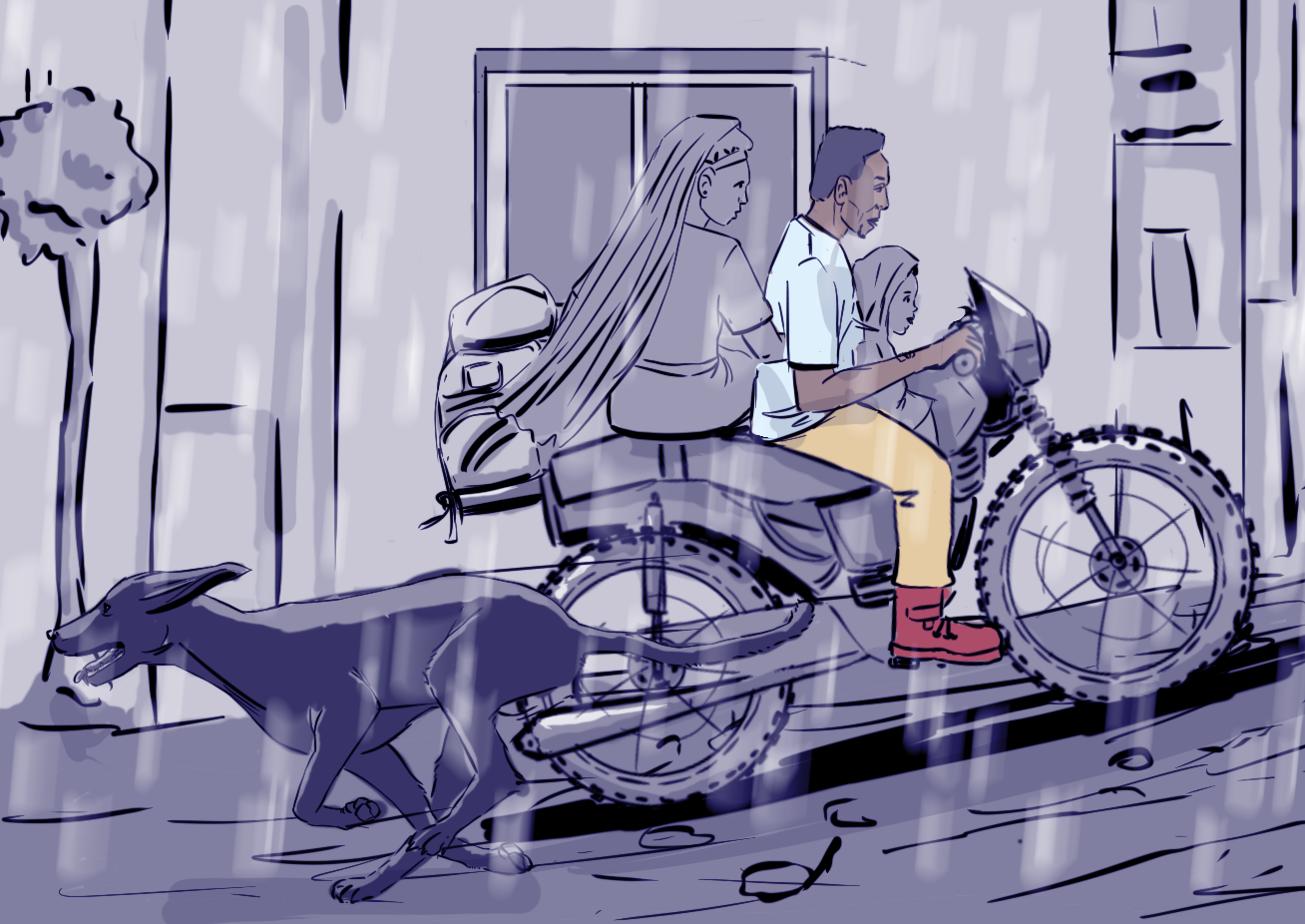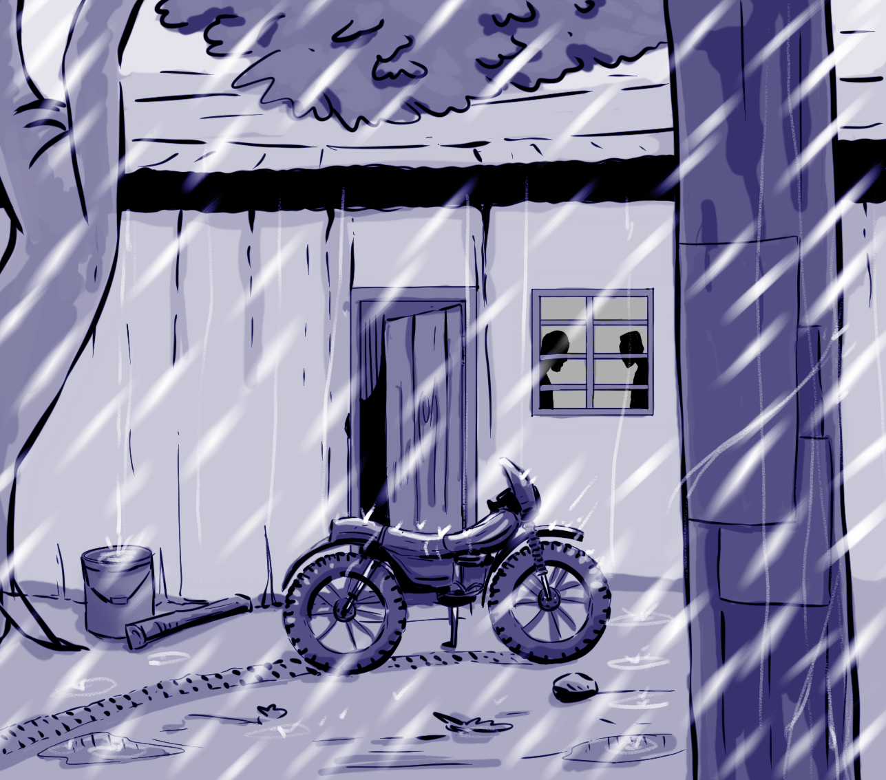 Kelvin rides his family to his Aunt under the rain towards the hilltop to ensure their safety in the event of any flood