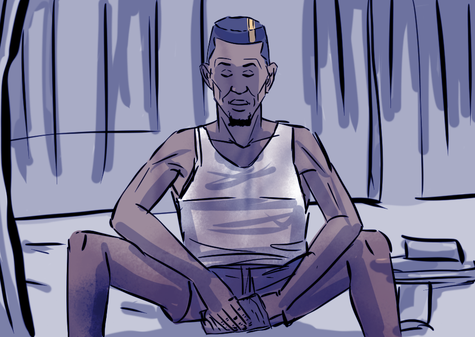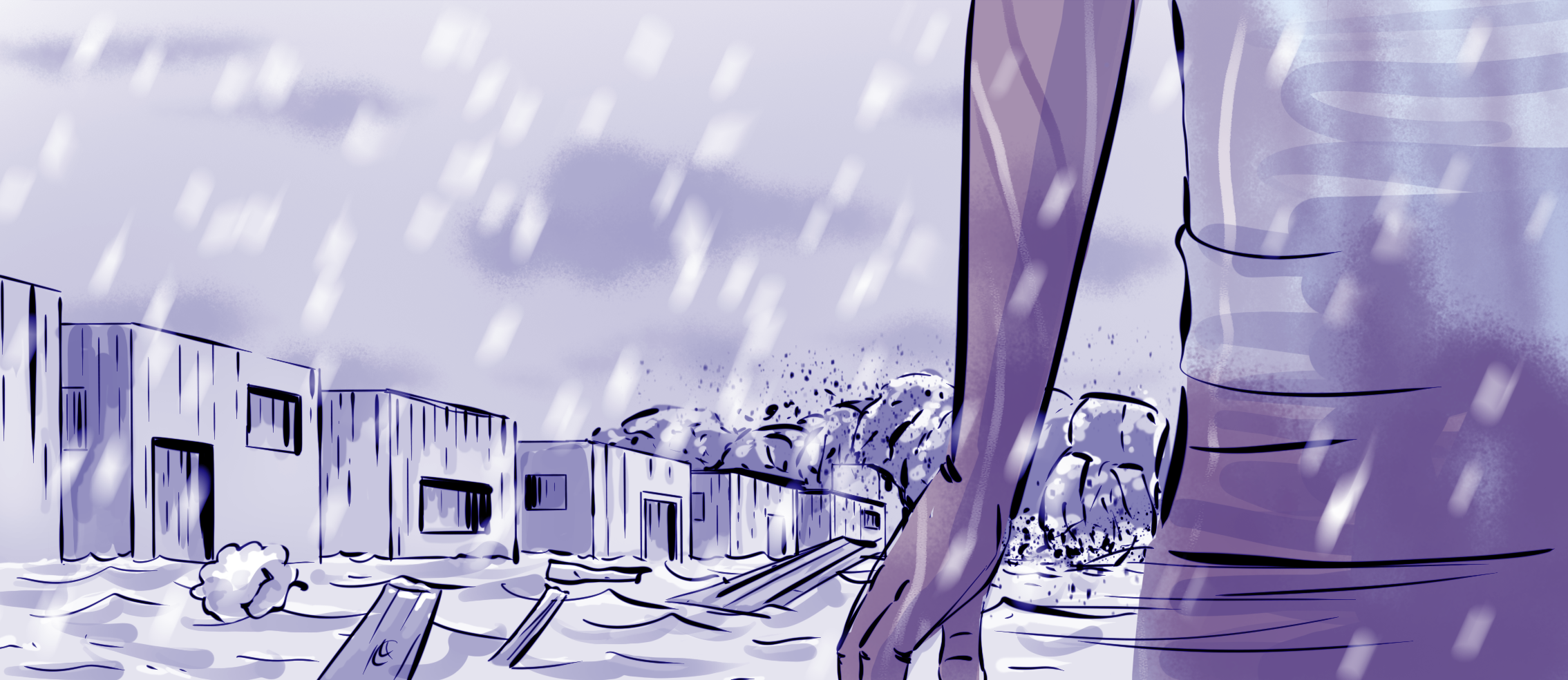 Kelvin stands up fast, goes to a make shift warehouse and rests, as rain and mudslide intensifies.