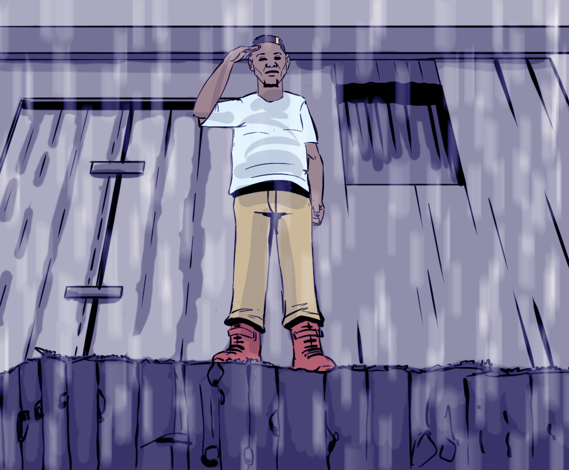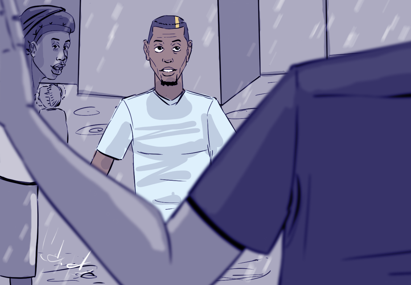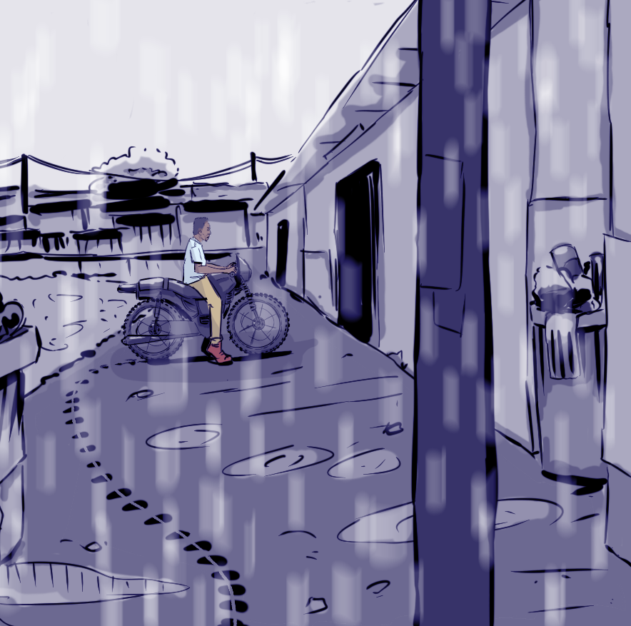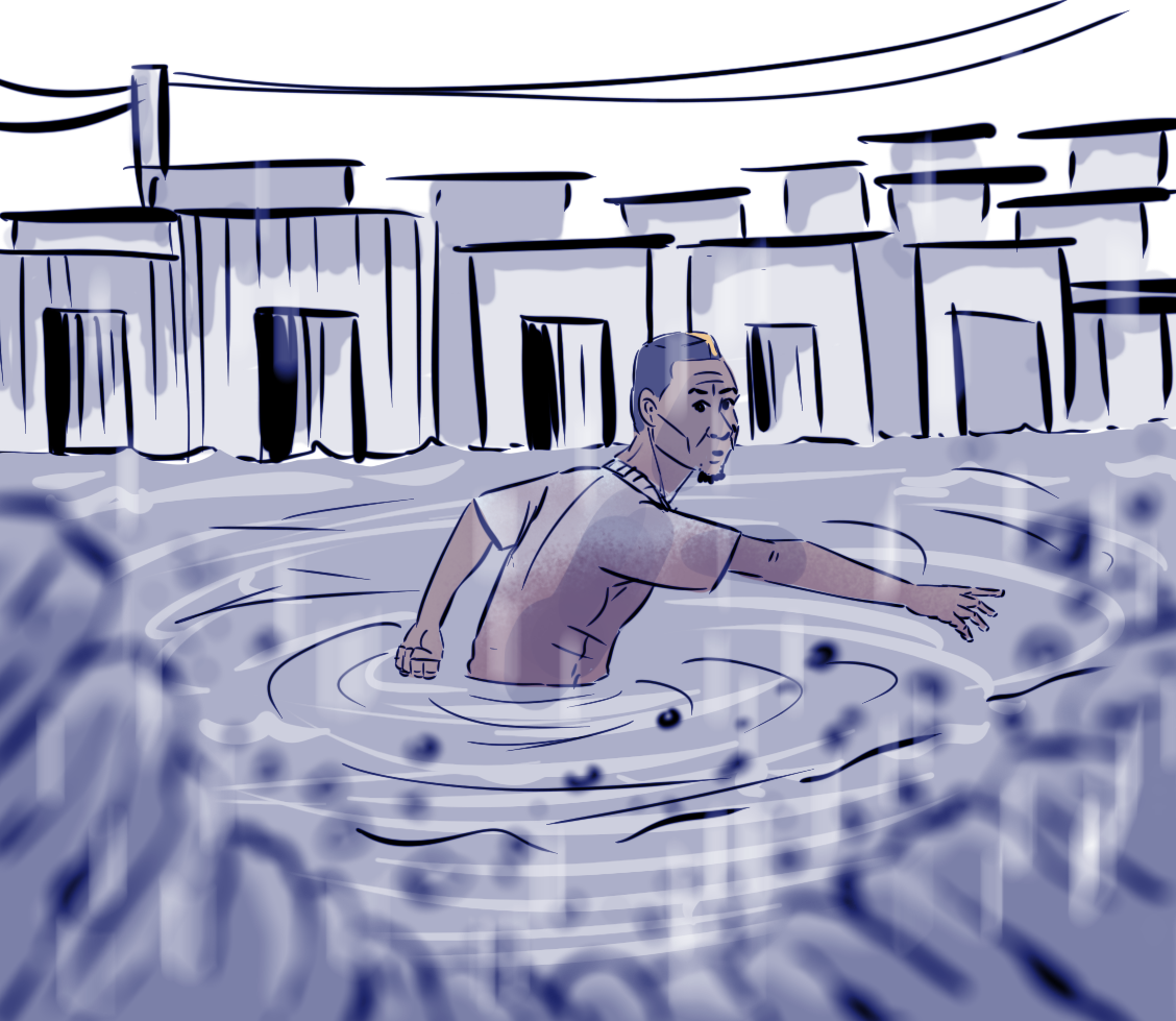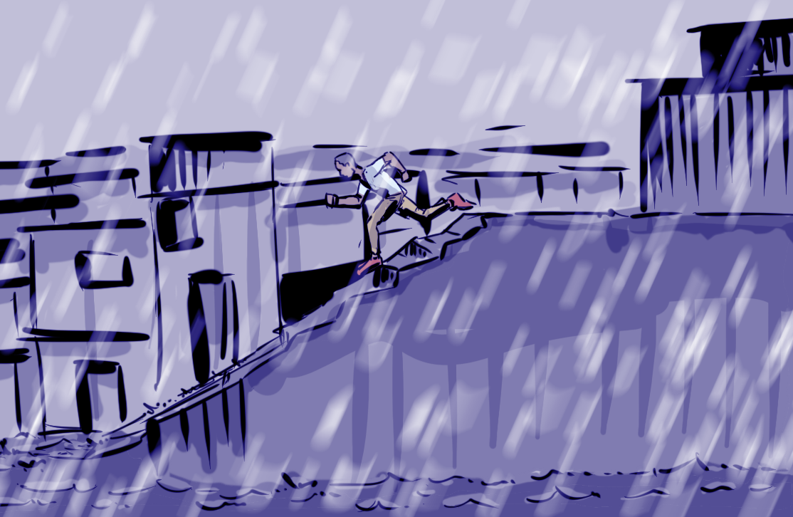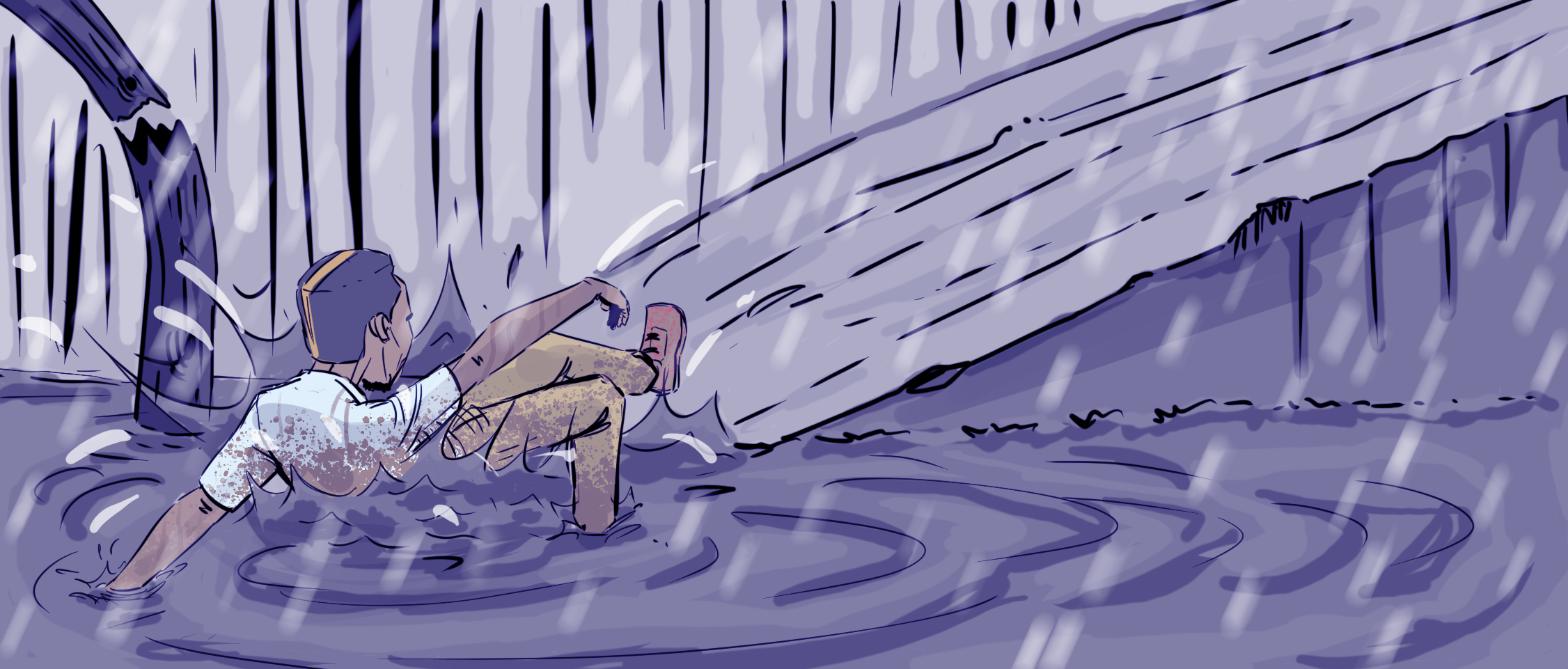 He almost hits his head on a timber wall. He lands his back on a tyre wall, he grunts out of pain, soaked in water, he stands ups and sees how the rain keeps tearing away the slums.