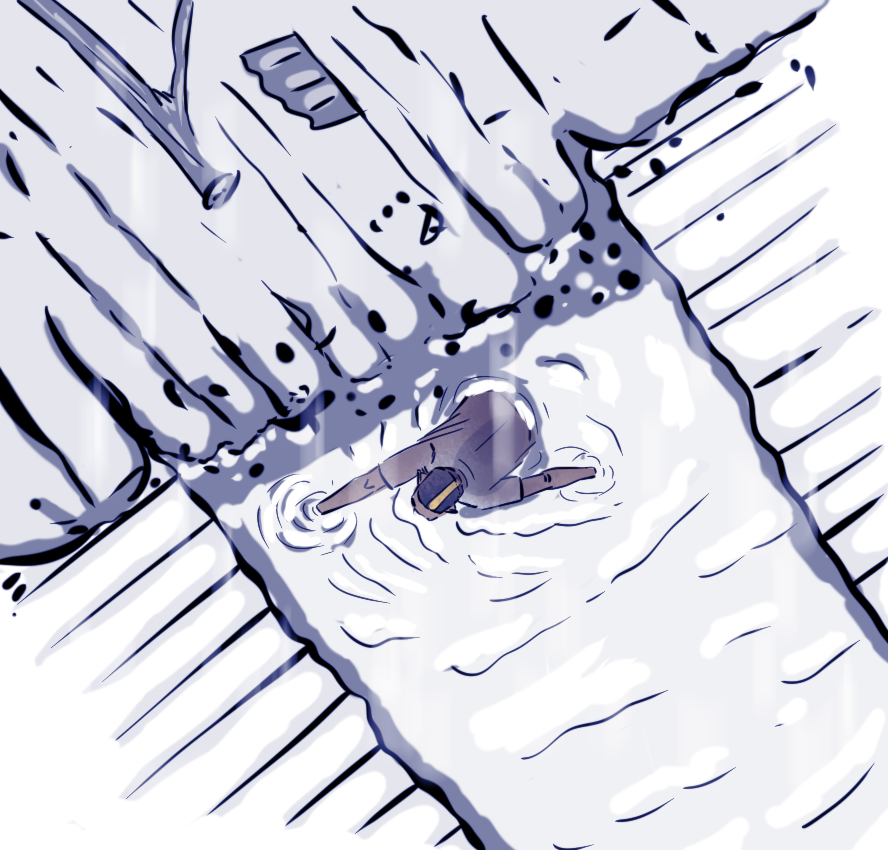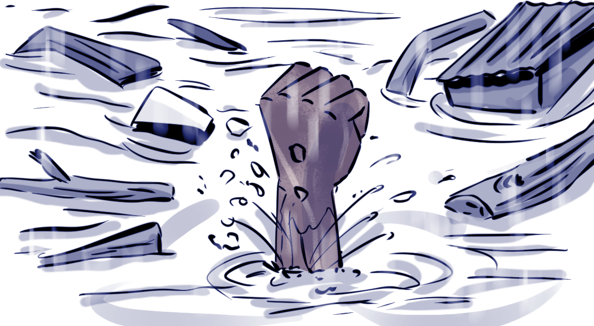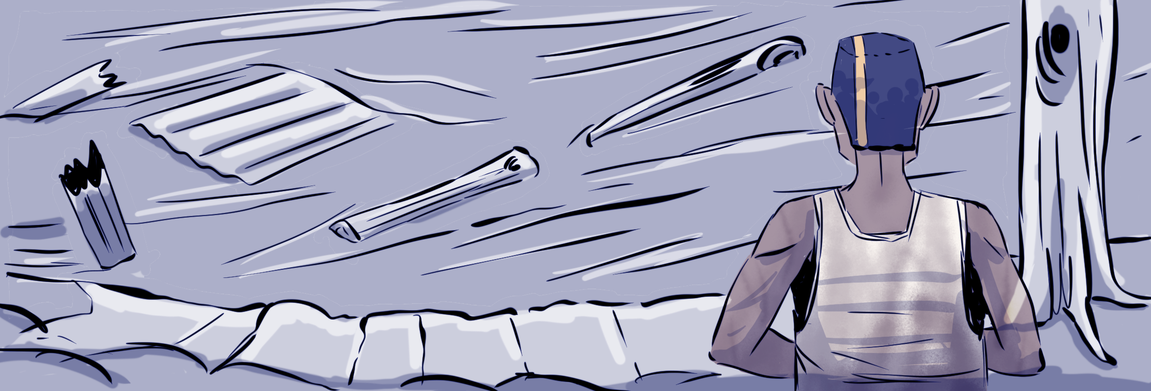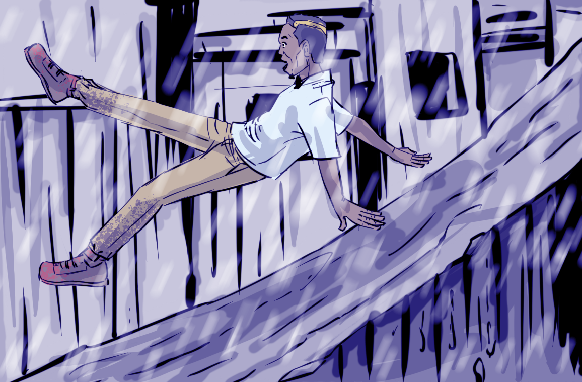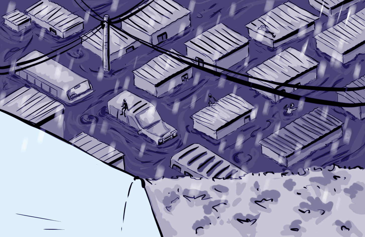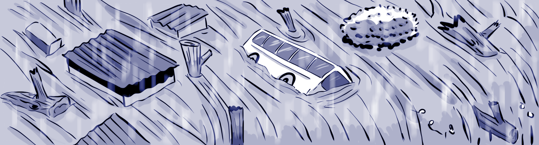 He almost hits his head on a timber wall. He lands his back on a tyre wall, he grunts out of pain, soaked in water, he stands ups and sees how the rain keeps tearing away the slums.