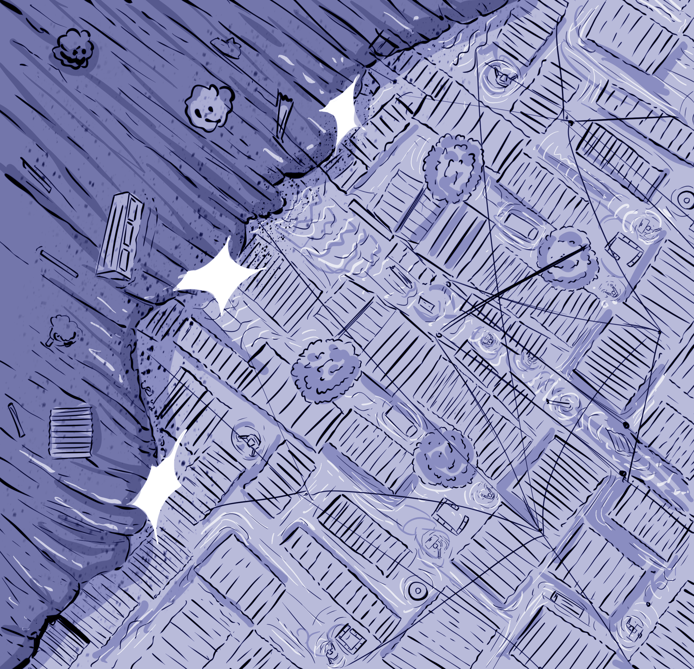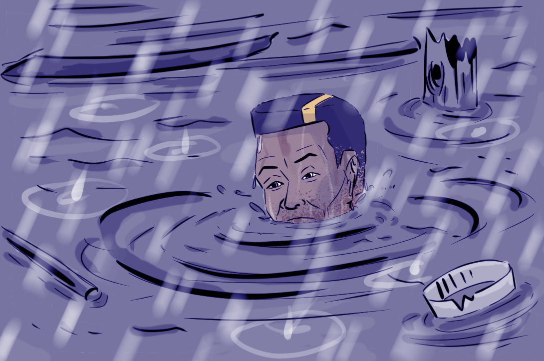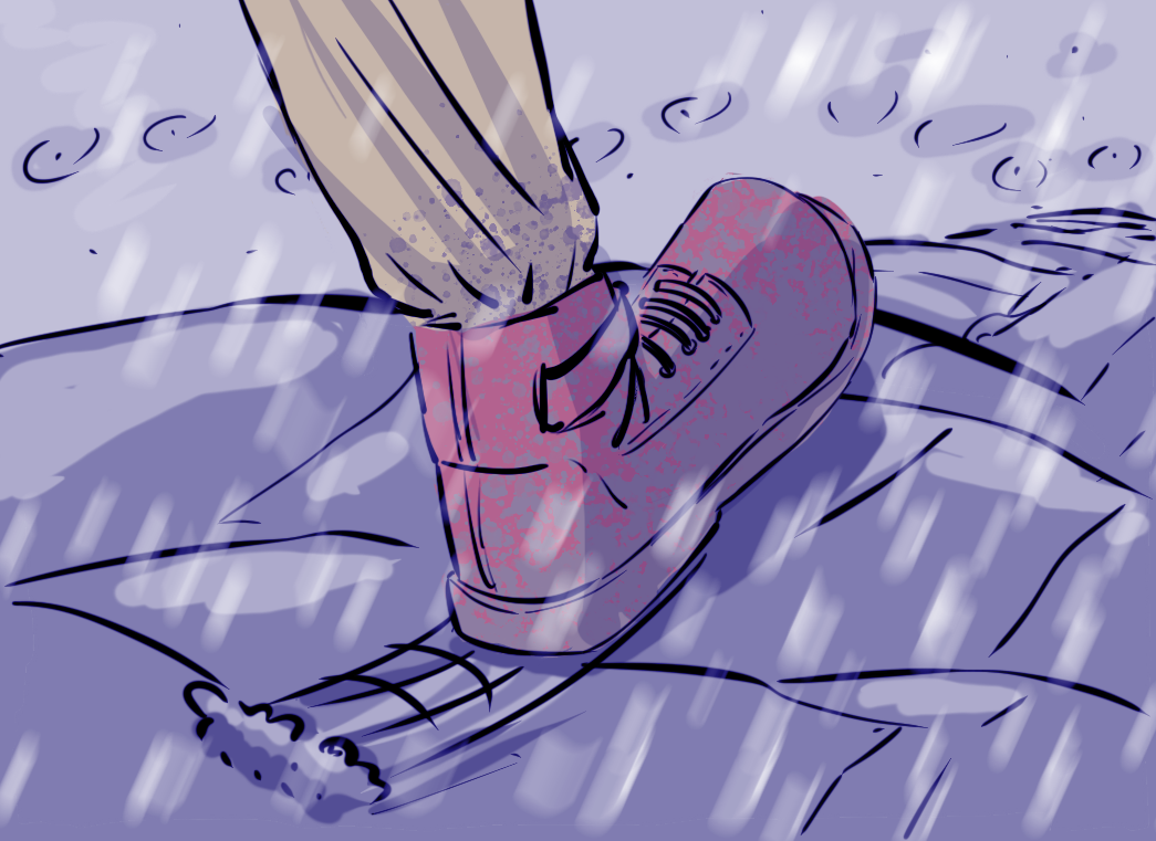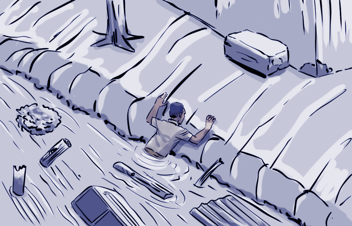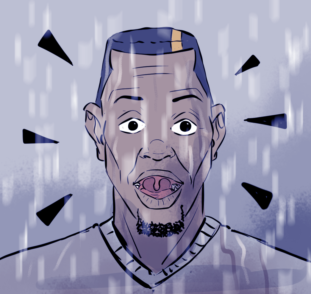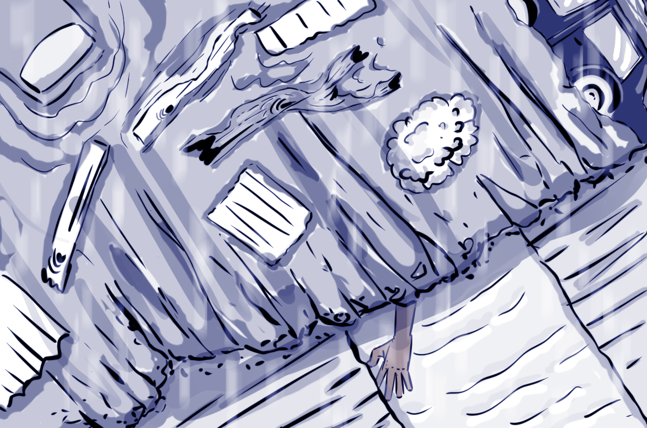 He almost hits his head on a timber wall. He lands his back on a tyre wall, he grunts out of pain, soaked in water, he stands ups and sees how the rain keeps tearing away the slums.
