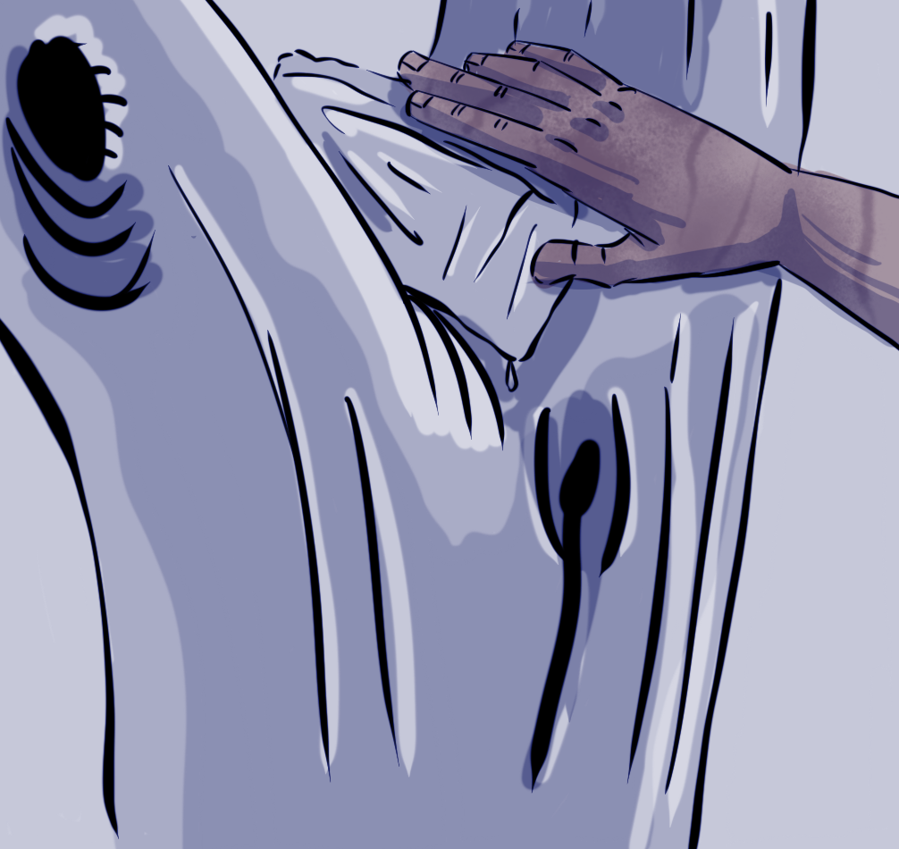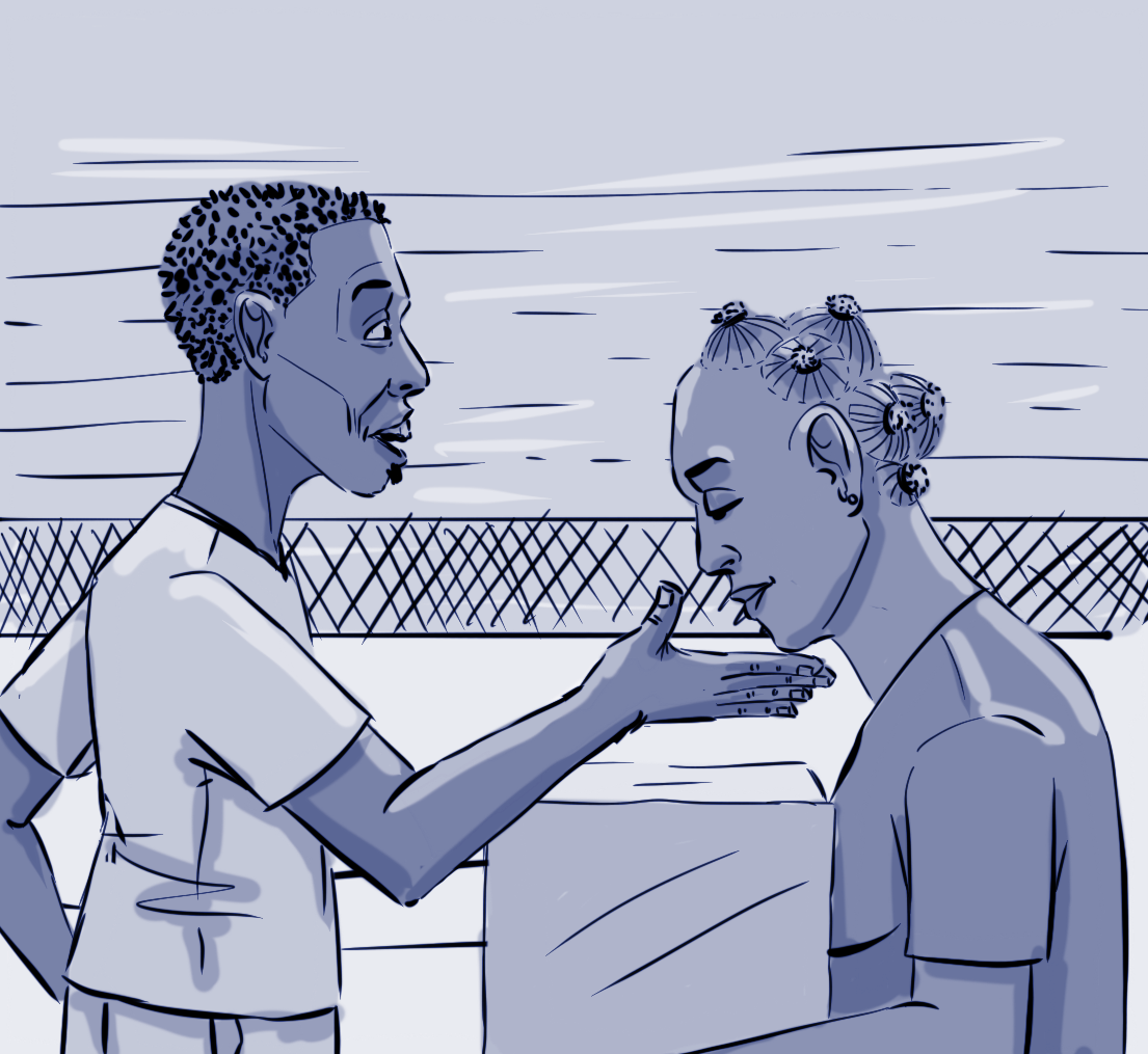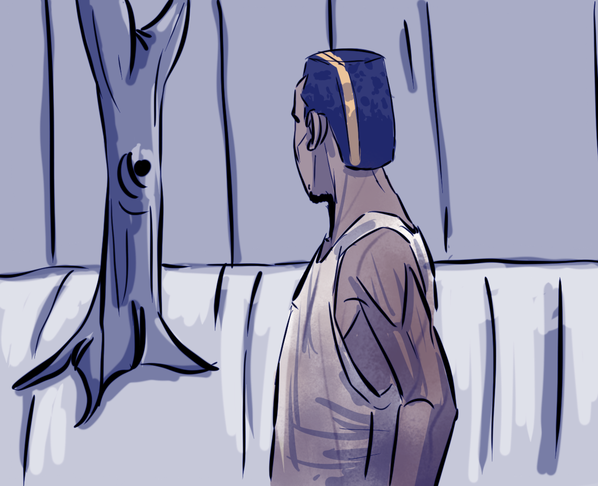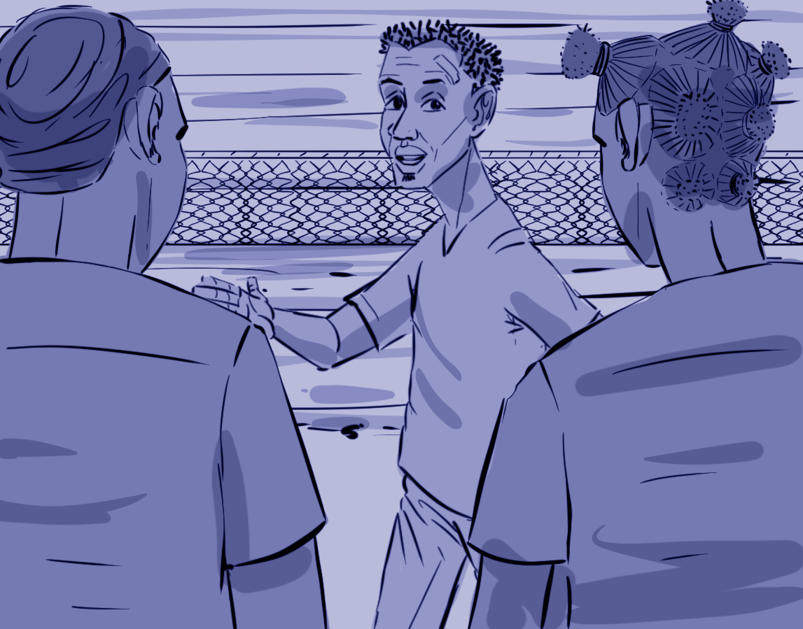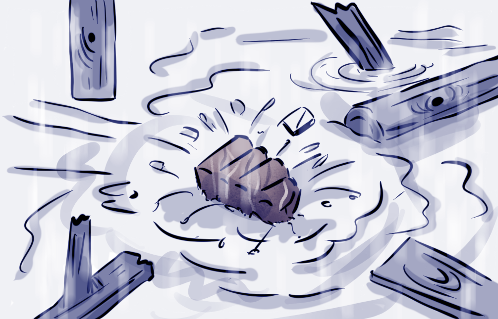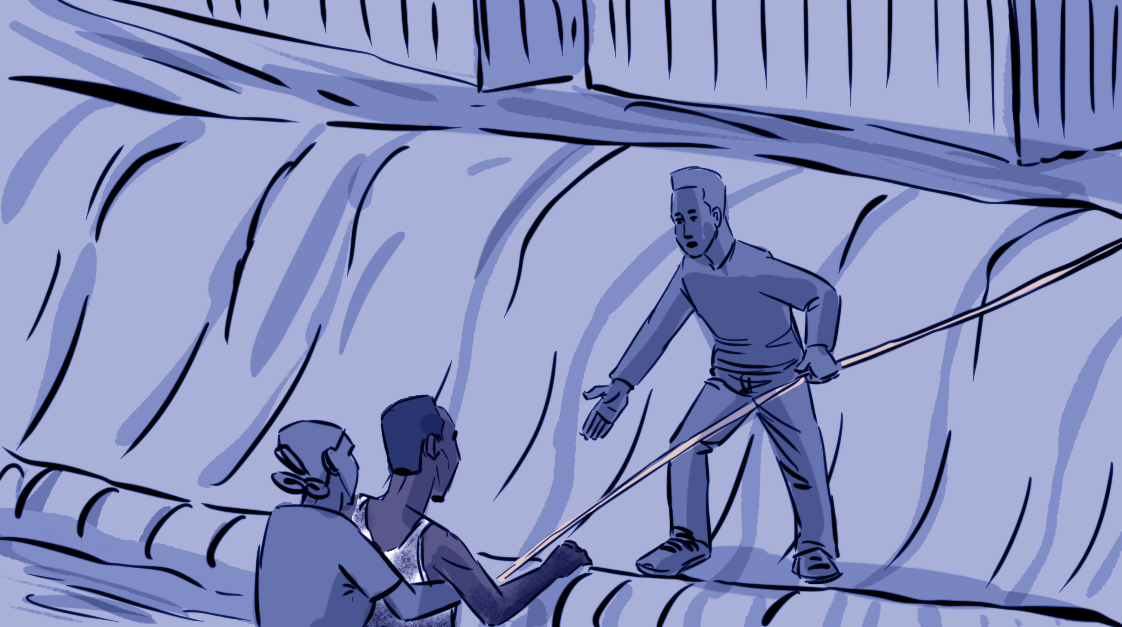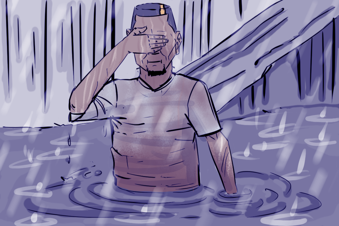 He almost hits his head on a timber wall. He lands his back on a tyre wall, he grunts out of pain, soaked in water, he stands ups and sees how the rain keeps tearing away the slums.