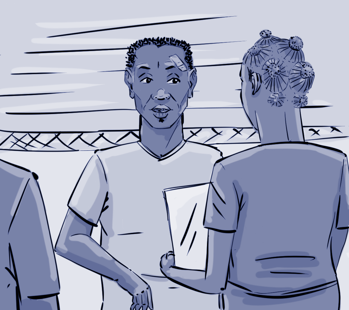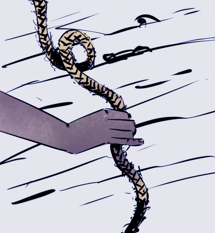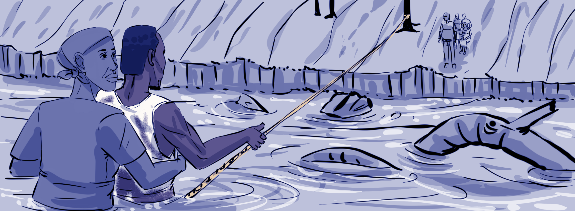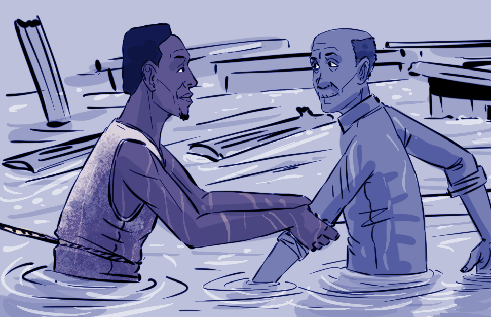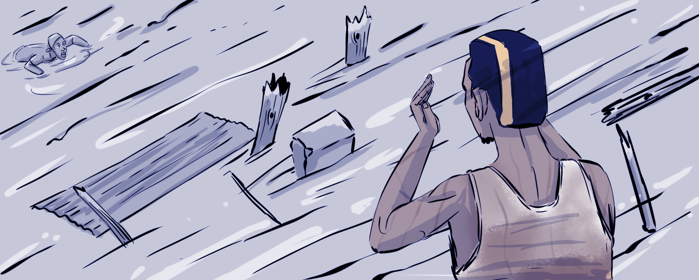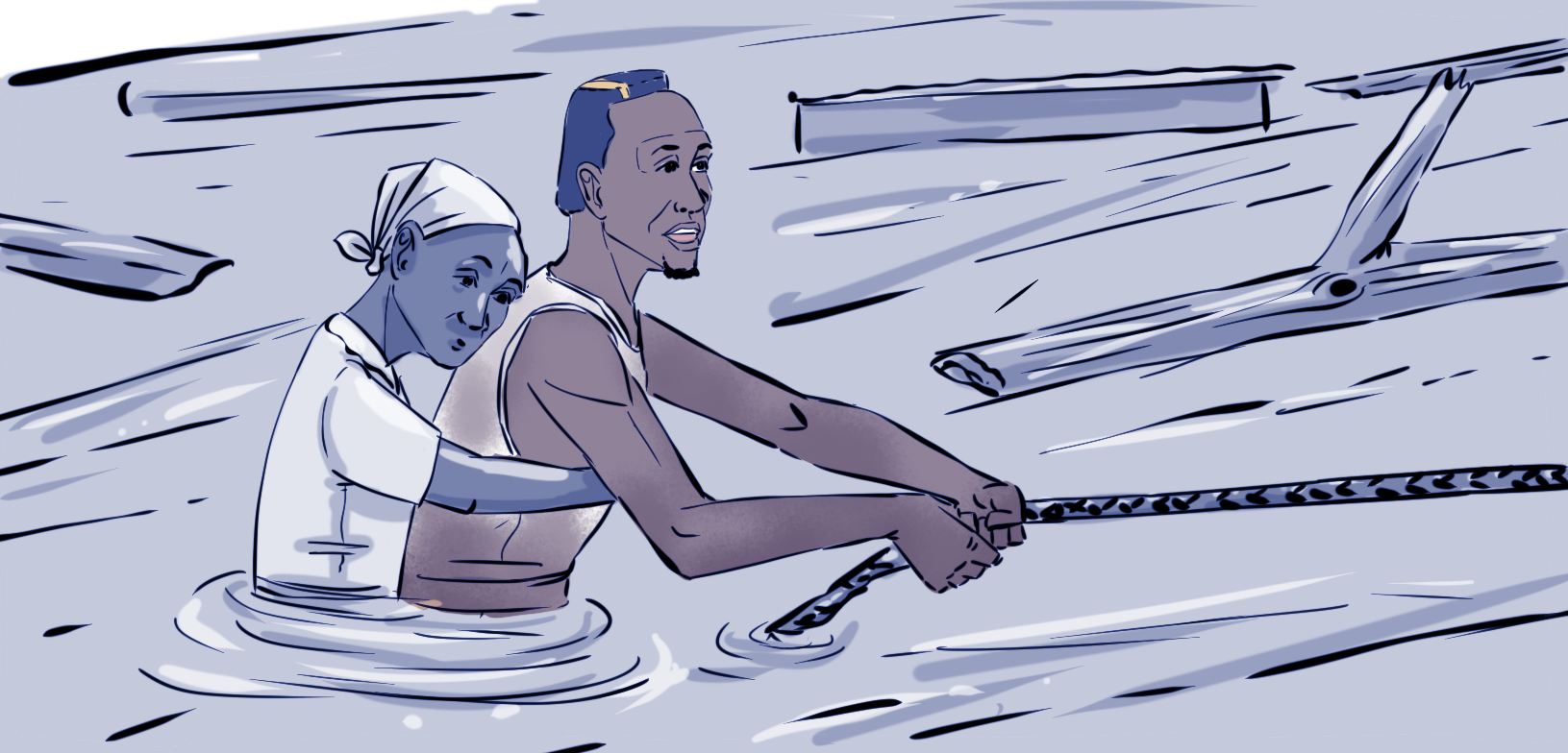 Kelvin grabs a rope he found on the floor. He ties the rope to a tree few meters behind, wraps the rope on his waist. He navigates to the woman, who grabs him hard and drop him in water, Kelvin emerges calms her down as other people call for his help stuck in another collapsed house.