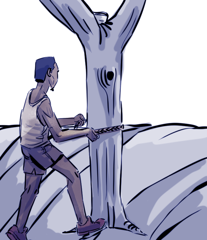 Kelvin grabs a plastic bag, takes his phone out wraps it in plastic, stores it on a tree, then rushing towards the valley.
