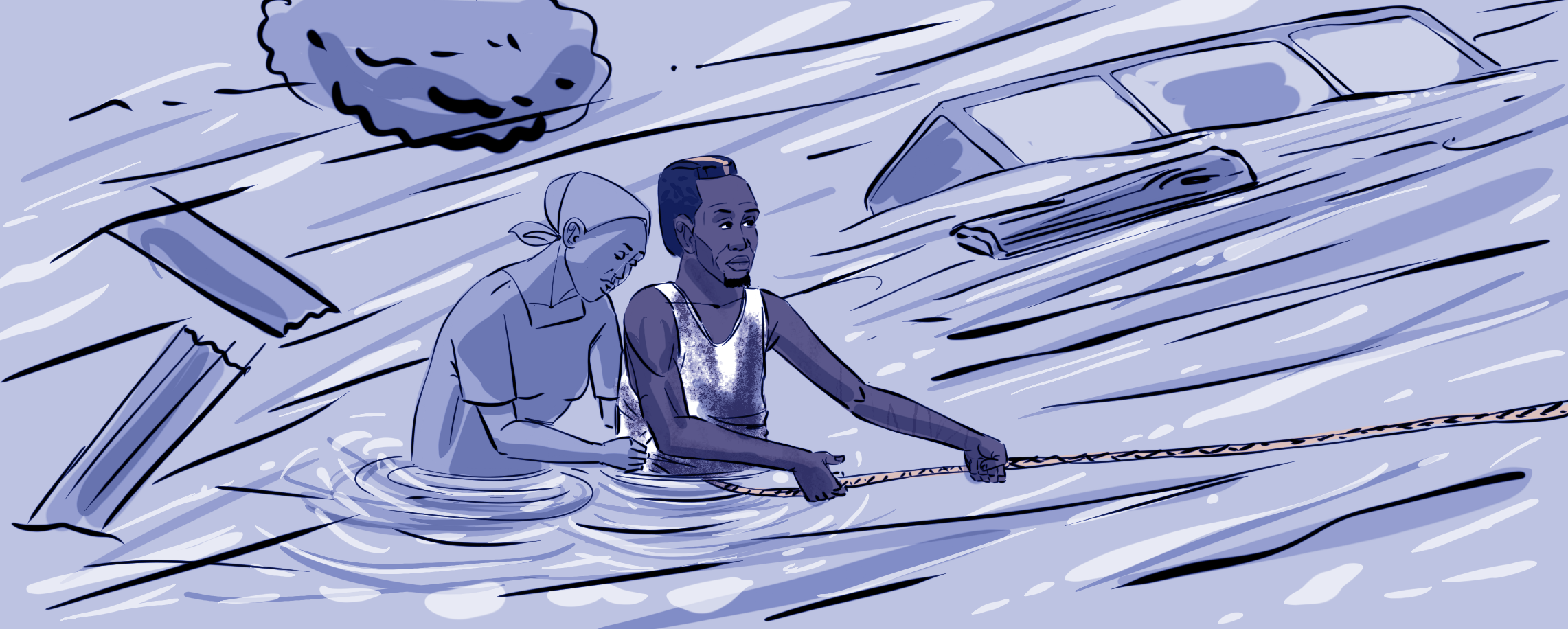 As the rain poured, Marie's heart raced with fear. Memories of past floods flooded her mind. They had to reach Kelvin's aunt's place on the hill, fast—before the waters rose too high.