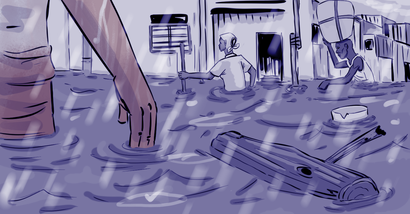 By the time Kelvin got his family to safety, the level of water has risen to the knee level. Kelvin see a lot of people trying to protect their property and tries to rush down to help