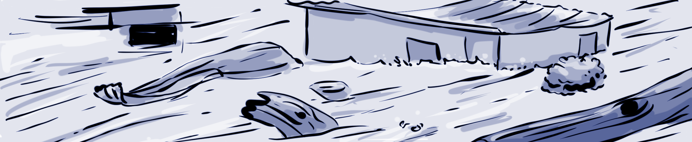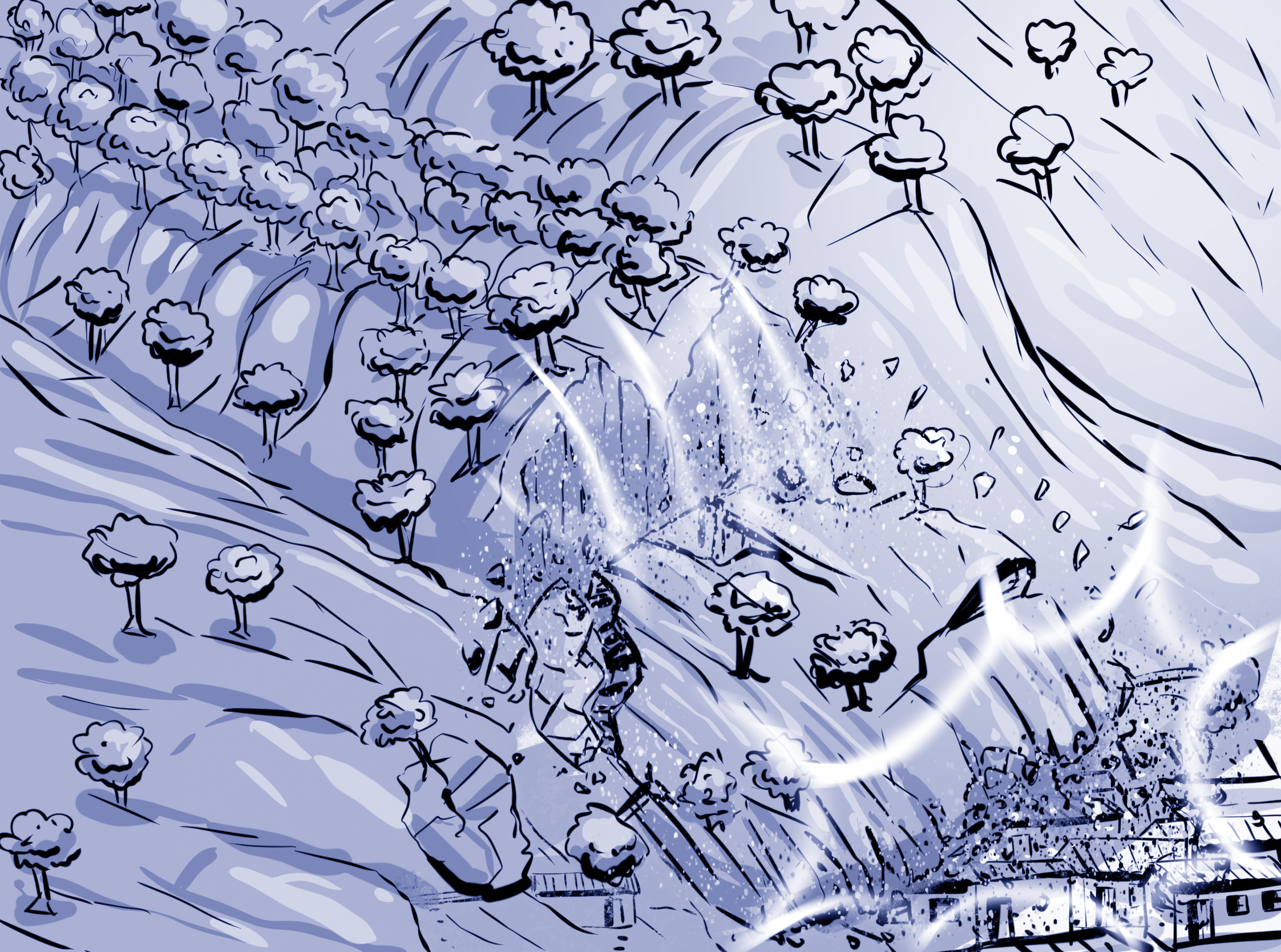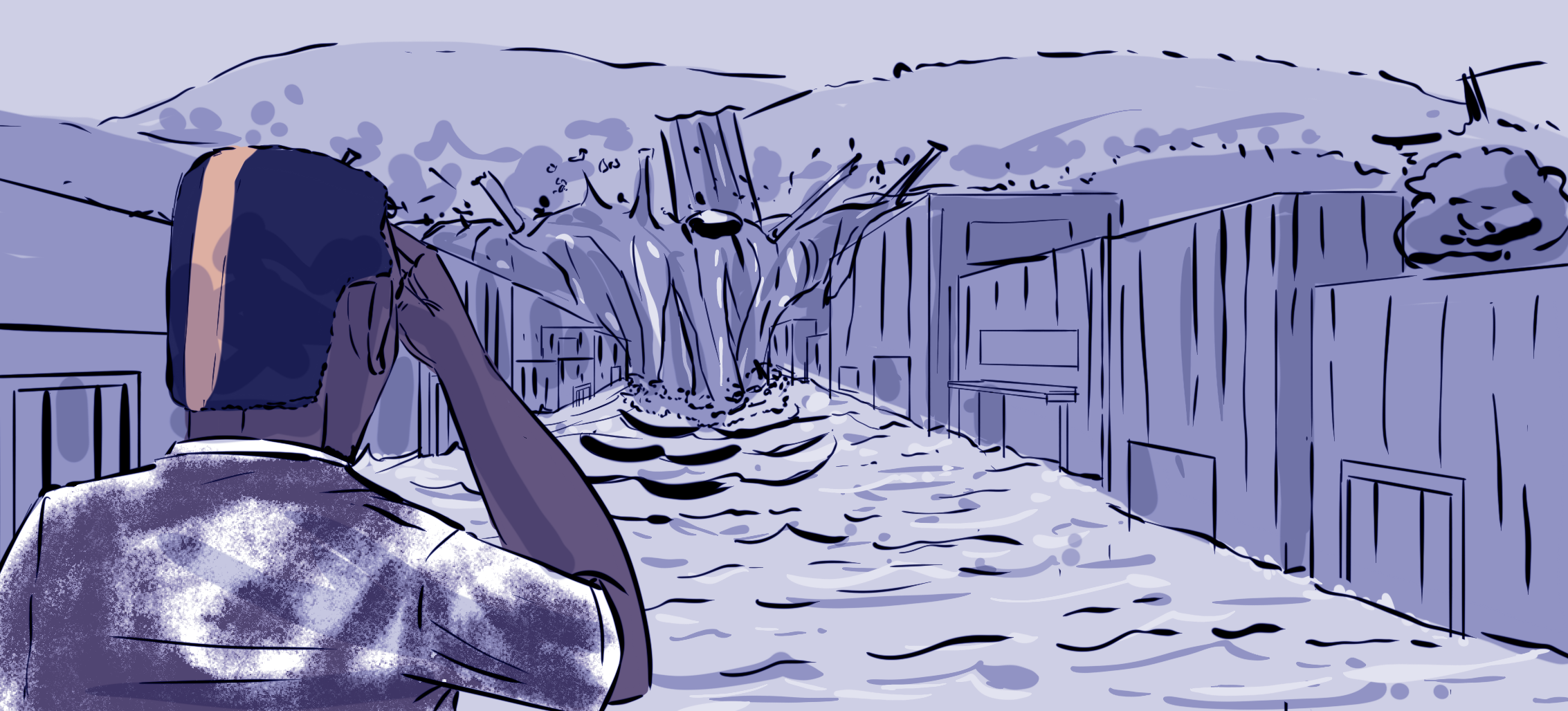 Kelvin looking at the mudslide descending fast down the slope, his eyes widen and thoughts run through his head, meanwhile we hear cries.